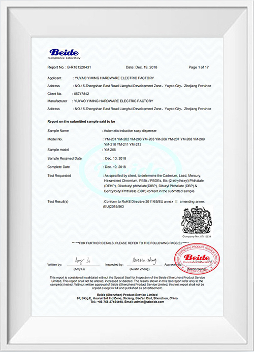 20431 RoHS dez itens Relatório Dispensador de sabão com sensor automático